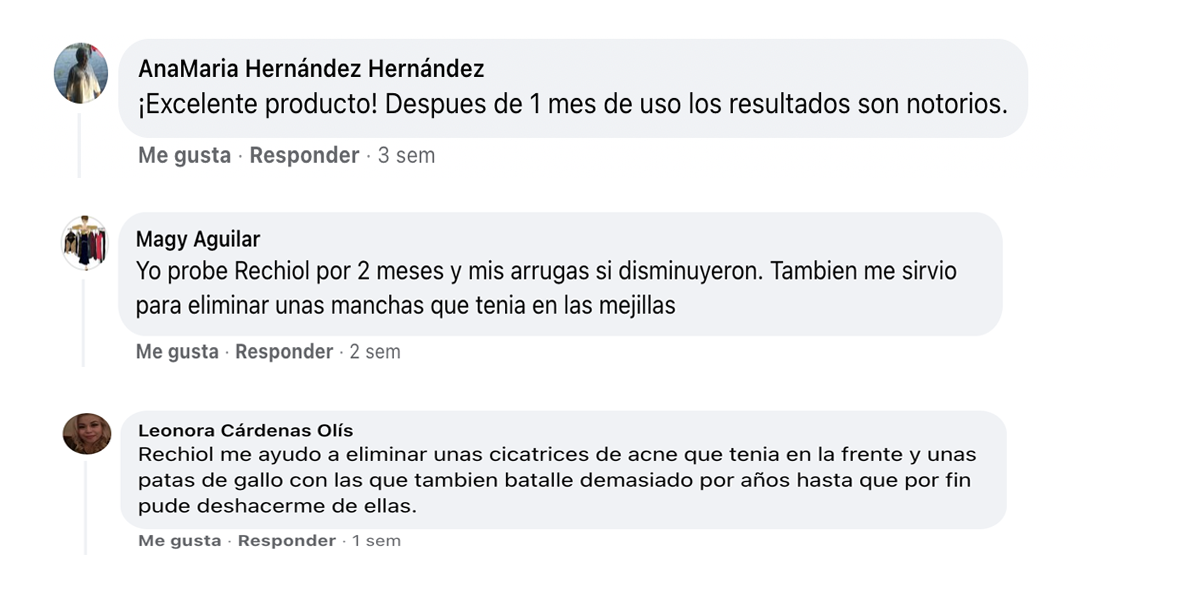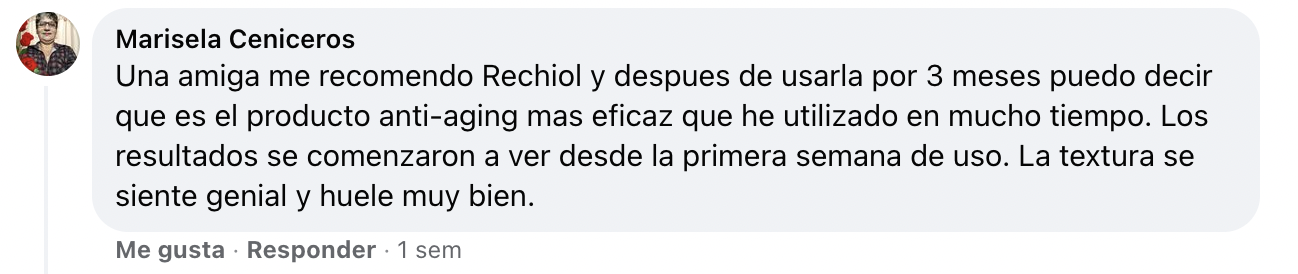 Después de muchos ensayos clínicos exitosos, las cosmetologas y dermatólogos de todo Latinoamerica han empezado a recomendar la crema Rechiol a pacientes que desean eliminar arrugas y lineas de expresion sin tener que recurrir a procedimientos quirúrgicos costosos .